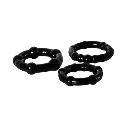 Three stretchy C-rings keep your newly enlarged member harder, longer, with bumpy textures for added stimulation. Use them alone or stacked for extra blood flow control.