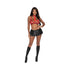From the Exposed by Magic Silk collection, this style includes: a red and black plaid bralette featuring hook-and-eye closures in the back and adjustable shoulder straps with gold-tone sliders, a black wet-look peplum skirt, and a red tie collar.